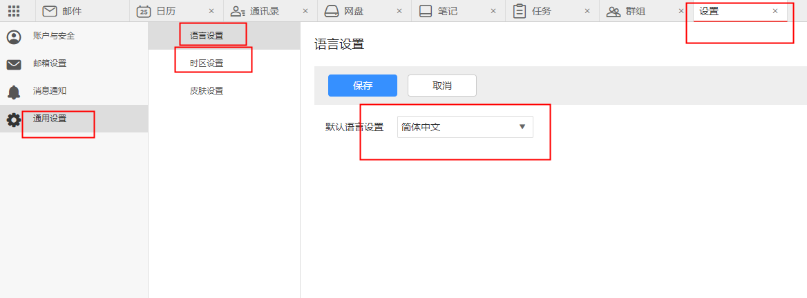 1、登录邮箱后点击右上角“邮箱设置”,在左侧展开设置功能列表中点击“语言时区”,选择您需使用的语言时区保存即可。同样,点击"时区设置",可以选择需要的时区。