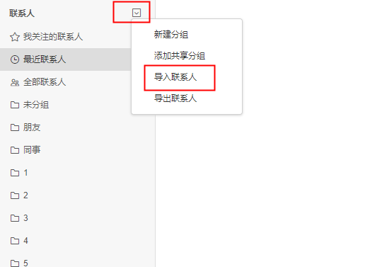 2)点击联系人右侧的下拉箭头,单击“导入联系人”,开始导入操作