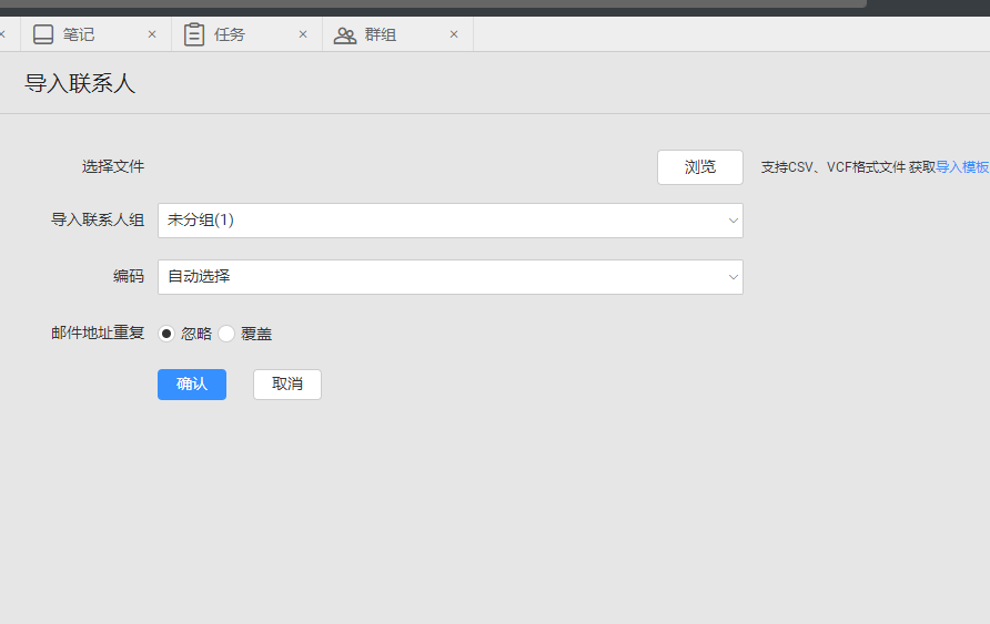 1)选择文件:从本地上传需要导入的文件。支持CSV和VCF格式文件。