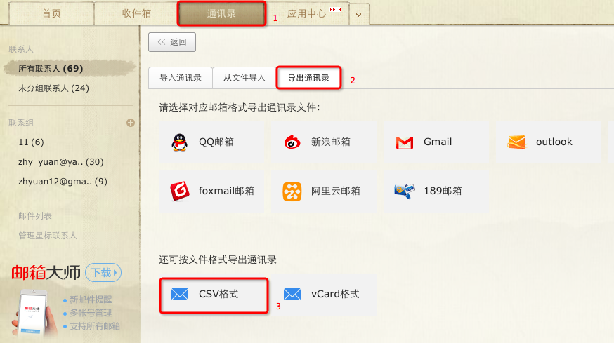 2)如果导入不成功一般是因为导入的文件格式有问题。各大邮箱运营商的通讯录导出方式如下: