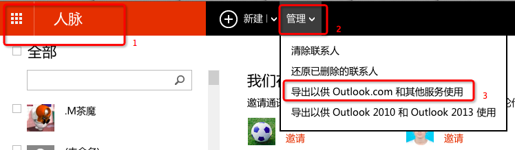人脉→管理→导出供outlook.com和其他服务使用