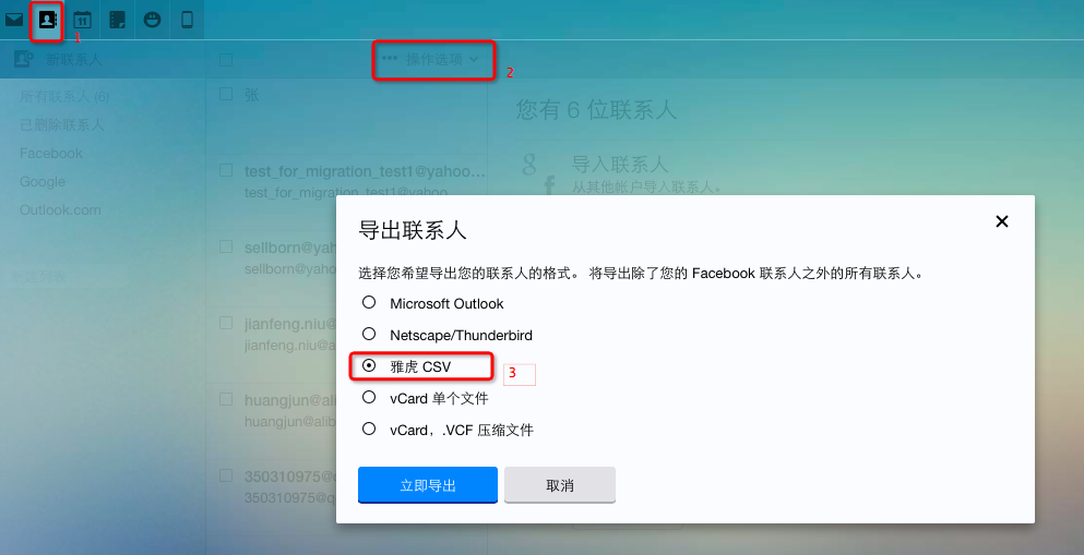 通讯录→操作选项→导出→雅虎CSV